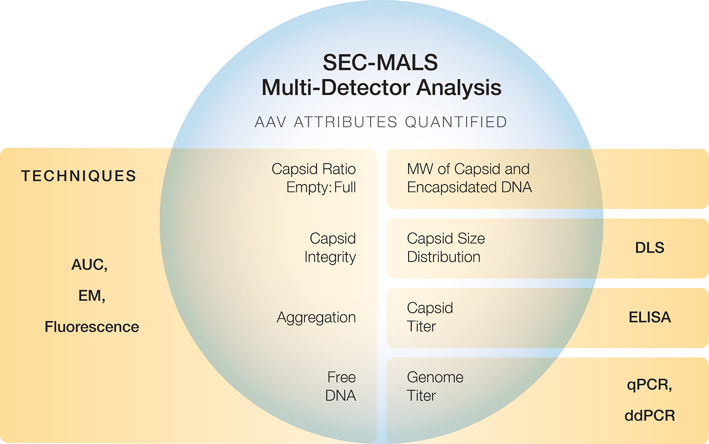 The workhorse method for critical quality attribute (CQA) quantification and extended characterization is SEC-MALS. Coupling size-exclusion chromatography to Wyatt’s industry-standard DAWN™ multi-angle light scattering and Optilab™ refractive index detectors and supported by a comprehensive guide to preparing and validating standard operating procedures, SEC-MALS has become a platform method for automated AAV characterization. Results closely match those of other common techniques, and the limit of sensitivity is just 5 x 1010 capsids/mL. Wyatt’s unique Method Implementation and Training™ offering for SEC-MALS analysis of AAVs ensures that the instruments are utilized to the fullest, from the start.