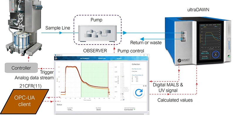 On-line RT-MALS combines an ultraDAWN with an auxiliary pump to draw sample from the process unit (here an ÄKTA™ ready preparative LC system). OBSERVER software orchestrates the measurements, sychronizing with the chromatography steps, calculating product attributes and feeding results back to the process controller such as UNICORN™ software or an OPC-UA client.