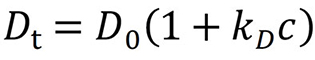 In einer ideal verdünnten Lösung ist der mit DLS gemessene Diffusionskoeffizient (Dt) nicht von der Konzentration des gelösten Stoffes abhängig. Mit zunehmender Konzentration wird die Lösung weniger ideal, und es wird eine Expansion erster Ordnung durchgeführt. Für den Diffusionsinteraktionsparameter kD (in Einheiten von mL/g) ist die Korrektur erster Ordnung des Diffusionskoeffizienten wie folgt: