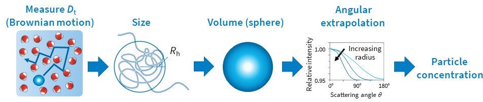 Unter Nutzung der Bestimmung der hydrodynamischen Größe aus dem Diffusionsverhalten und der gesamten Streuintensität kann eine weitere wichtige Eigenschaft gemessen werden: die Anzahl der Nanopartikel pro Volumeneinheit, N.