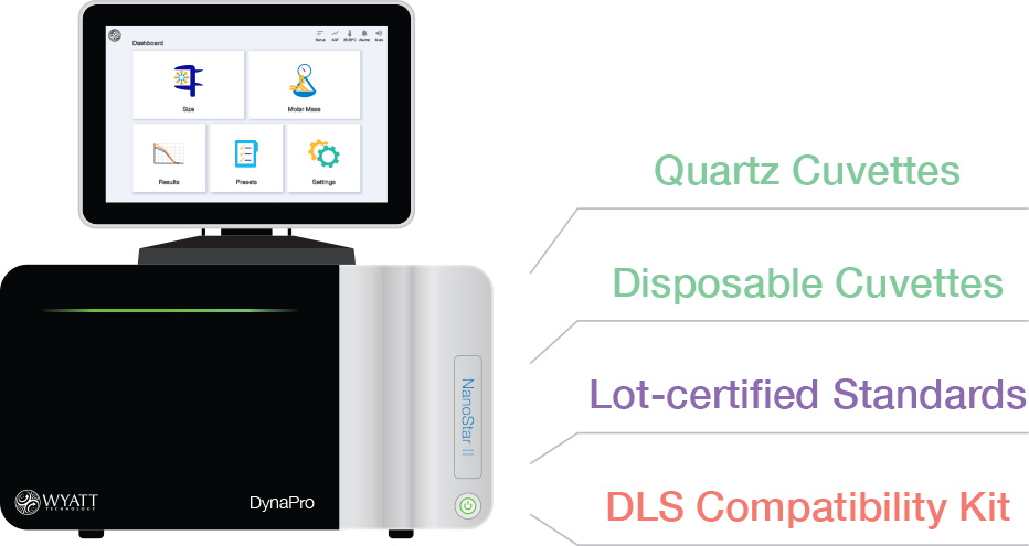用途が広くユーザーフレンドリーなDYNAMICSソフトウェアととDYNAMICS Touchオンボードアプリを組み合わせることで、NanoStarを利用して、サイズ、サイズ分布、粒子濃度、重量平均分子量だけでなく、第二ビリアル係数(A2またはB22)、拡散相互作用パラメーター(kD)、およびタンパク質の融解または凝集開始の温度(Tm, Tonset)などのサンプルの安定性に関連する溶液特性も測定できます。