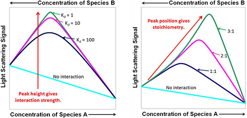 Conceptually, CG-MALS is an absolute technique based entirely on first principles and a rigorous thermodynamic foundation. Since static light scattering measures weight-average molar mass, CG-MALS provides not only the stoichiometric ratio, but full complex stoichiometry. Systems undergoing self-interaction, hetero-association, or even simultaneous reversible self- and hetero-association may be quantified. A particular strength of CG-MALS is the analysis of metacomplexes (e.g., the self-association of simple complexes such as the reaction A+B+A+B↔AB+AB↔(AB)2). Interaction analysis is not limited to macromolecules but may be extended to the behaviour of larger objects such as liposomes or microgel particles (including macromolecules adhering to such objects), and the same instrumentation may serve to automate the study of additional phenomena such as nanoparticle degradation kinetics.
