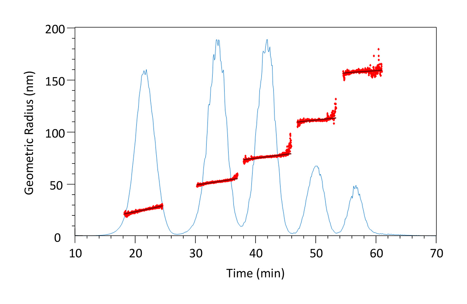 FFF separates the particles by size. As each elution volume enters the DAWN, light scattering makes two independent measurements: the rms radius Rg, by means of MALS, and the hydrodynamic radius Rh, by means of DLS. The ratio Rg:Rh, known as the 'shape factor,' provides an indication of a primary structural parameter.