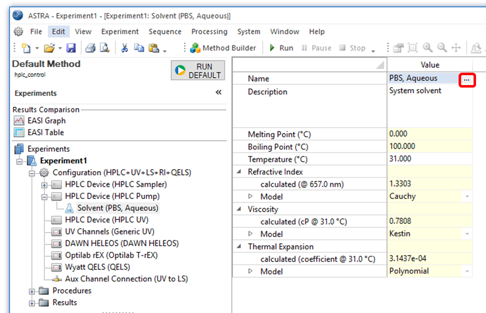 ASTRA already comes equipped with many commonly used solvents. You can select your solvent in an ASTRA experiment by navigating to the Configuration > Pump > Solvent window and clicking on the ellipsis.