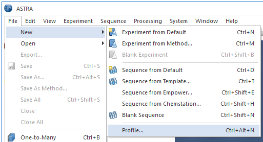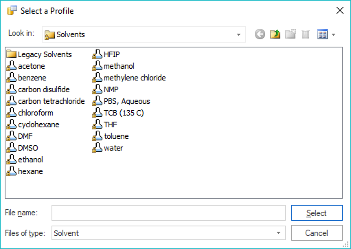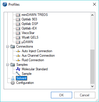If you want to add a solvent to ASTRA, Navigate to File | New | Profile to open the Profiles dialog box. Scroll to the bottom of the dialog box and choose Solvent. Click on OK.
