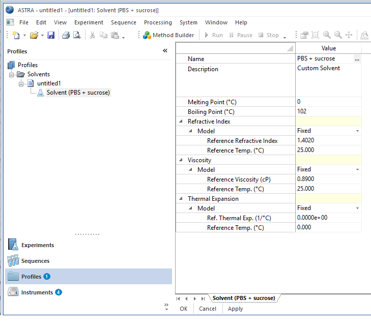 These instructions only address solvents at a constant temperature with Fixed models for each parameter. If you are operating at varying temperatures, you may want to use models that address temperature dependence. Contact Wyatt Customer Support for more information.