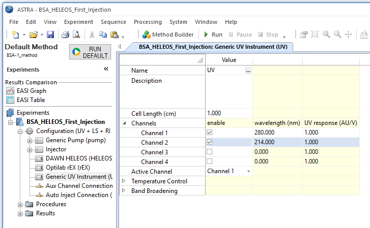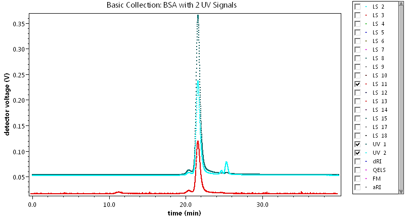Collecting multiple UV wavelengths in ASTRA is useful for processing experiments where the sample contains two separate components that absorb at different wavelengths. For example, for conjugated proteins such as protein-DNA/RNA complexes where both the 260 nm for DNA/RNA absorption and the 280 nm wavelength for protein absorption could be collected at the same time. For proteins, you can also choose to monitor both the standard 280 nm absorption as well as 214 nm for higher sensitivity as shown in the picture.
