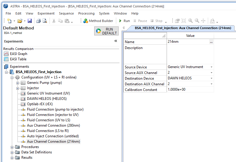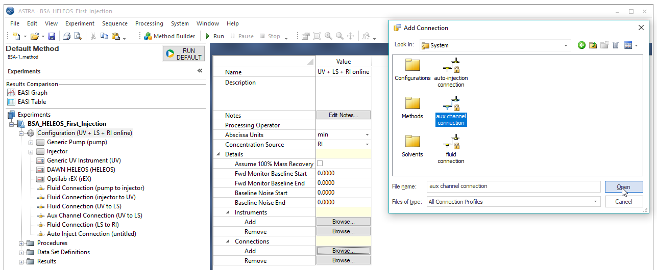 If you already have a UV instrument in your ASTRA method configuration, then you can add another channel connection which will be described further below. If you don’t, then first add one by right-clicking on your configuration and choosing Replace Configuration. Then, navigate to a configuration that supports a UV detector such as Configuration | Light Scattering | HELEOS™ | with Optilab™ rEX | UV + LS + RI online.